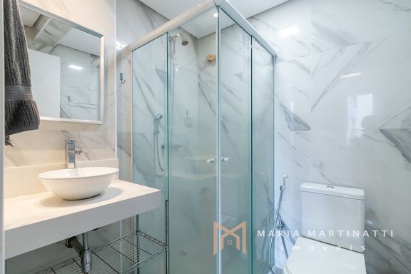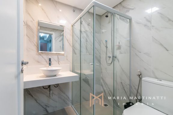 Espelhos nos banheiros e acabamentos de bom gosto.